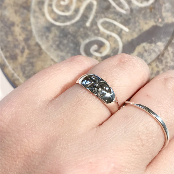 Original price $ 30.00 - Original price $ 30.00Original price$ 30.00$ 30.00 - $ 30.00Current price $ 30.00| /This smooth band ring has a peaceful face engraved in the front. Available in whole sizes 6-9. Sterling silver 1/4" at widest point of ring.