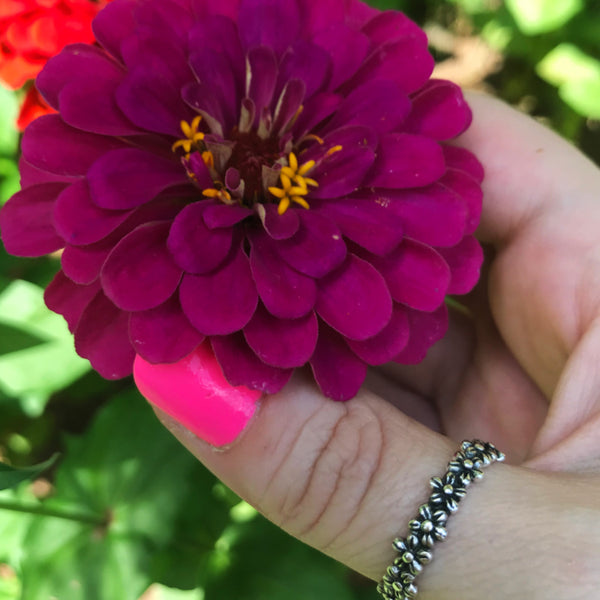 Original price $ 16.00 - Original price $ 16.00Original price$ 16.00$ 16.00 - $ 16.00Current price $ 16.00| /This sweet ring is an encircled band of five petalled flowers. Wear on its own our stack with another one of our fabulous rings! Sterling silver. A...