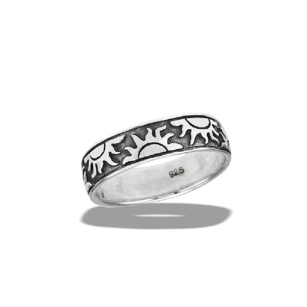 Original price $ 24.00 - Original price $ 24.00Original price$ 24.00$ 24.00 - $ 24.00Current price $ 24.00| /This sturdy band is encircled with flaming half-suns with oxidized background for detail. Available in whole sizes 5-10. Sterling silver. 1/4" wide...