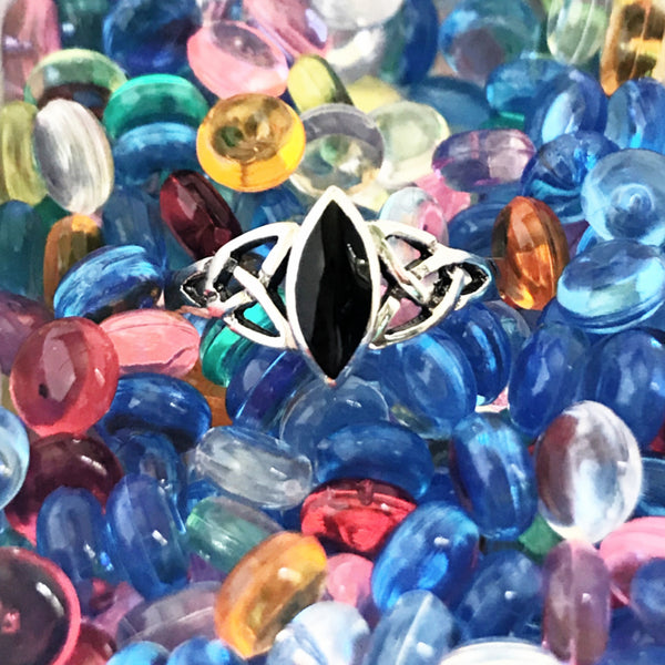 Original price $ 16.00 - Original price $ 16.00Original price$ 16.00$ 16.00 - $ 16.00Current price $ 16.00| /This classic ring is synthetic onyx in a marquis shape in the center flanked by two triquetra Celtic knots. Sterling silver. Available in whole si...