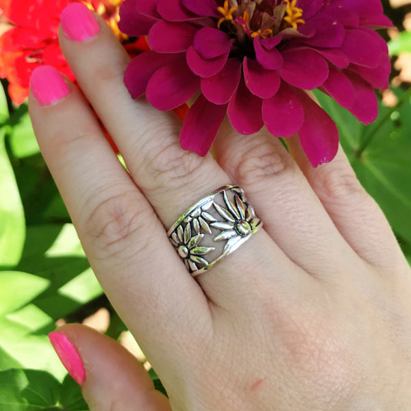 Original price $ 28.00 - Original price $ 28.00Original price$ 28.00$ 28.00 - $ 28.00Current price $ 28.00| /This wide statement ring has a flower cutout design of large daisies. Available in whole sizes 7-10. Sterling silver. 1/2" at widest point, taperin...