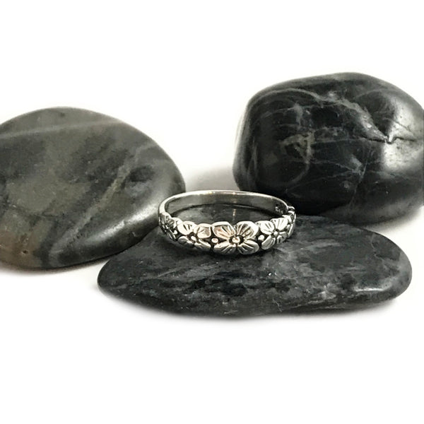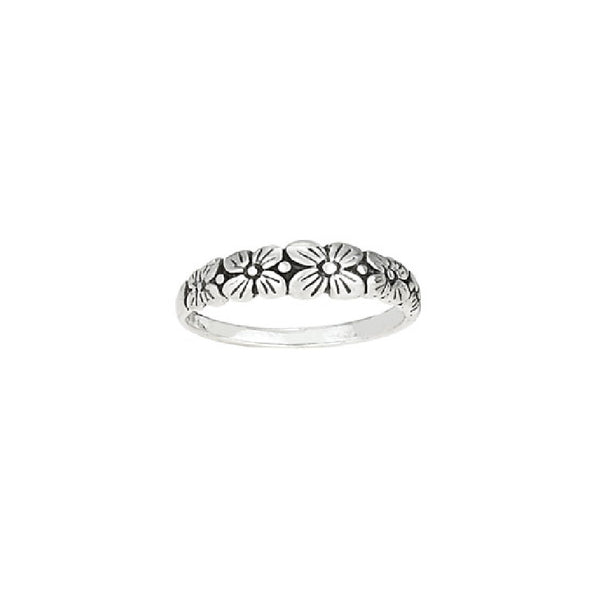 Original price $ 28.00 - Original price $ 28.00Original price$ 28.00$ 28.00 - $ 28.00Current price $ 28.00| /This solid sterling silver ring is a slim band with five flowers embossed across the front. Available in whole sizes 6-9. 3/16" wide (4mm) at wide...