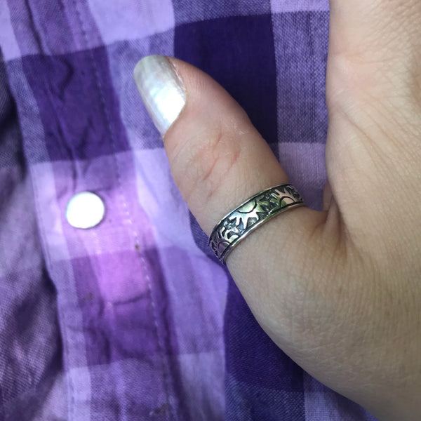 Original price $ 28.00 - Original price $ 28.00Original price$ 28.00$ 28.00 - $ 28.00Current price $ 28.00| /This sterling silver band has the phases of the moon carved in relief with an oxidized silver background. Available in whole sizes 6-11. 1/8" (4mm...