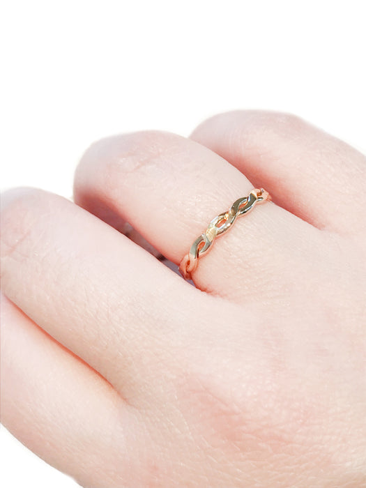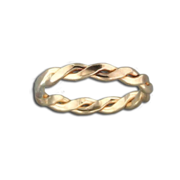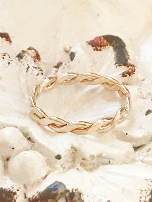This beautiful 14kt gold filled ring is a sturdy twisted 2 band braid. Great on its own or for stacking with others.