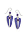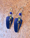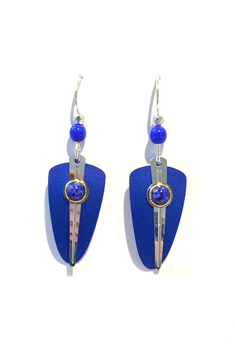 These geometric dangle earrings are handmade in Colorado by Adajio! The long dark blue shield has a silver spear that overlays with a bead of sodalite that is ringed in gold.