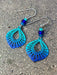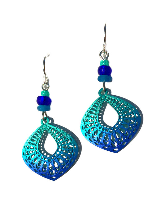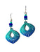 These vibrant dangle earrings have a stunning ombre effect in rich cobalt blue and teal enamel, with geometric shapes cut out in a fan shape.