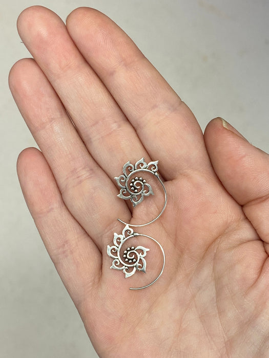 These earrings are a swirl of silver with pointed silver petal detail. Simply spiral in and go!