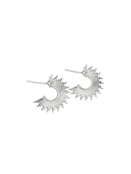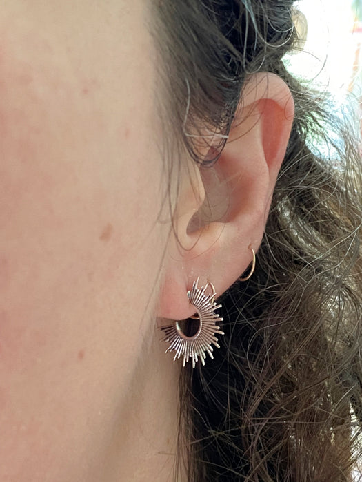 These hoop earrings are lined with bursting silver rays. Post backs.