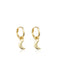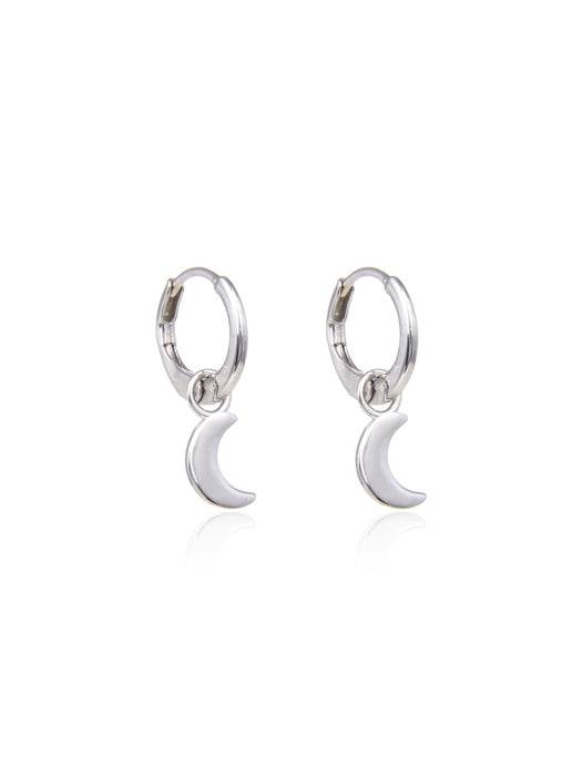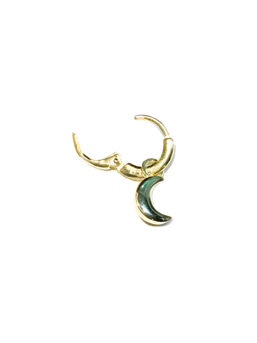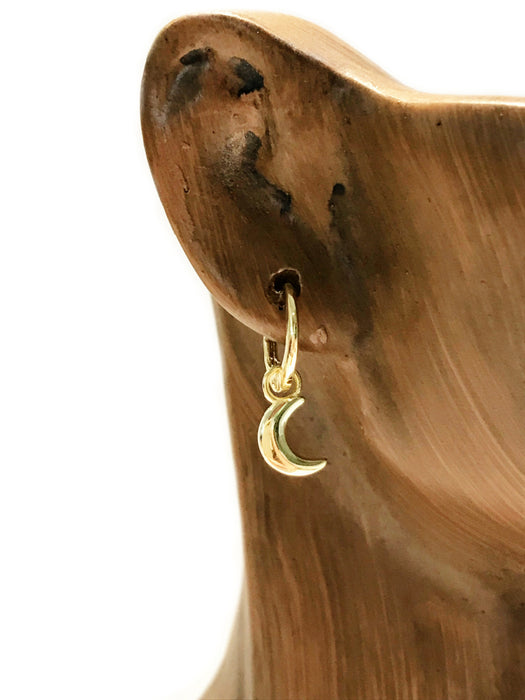 These trendy huggie hoops have a small crescent moon charm. Huggie hoops are hinged at the bottom and snap closed.