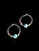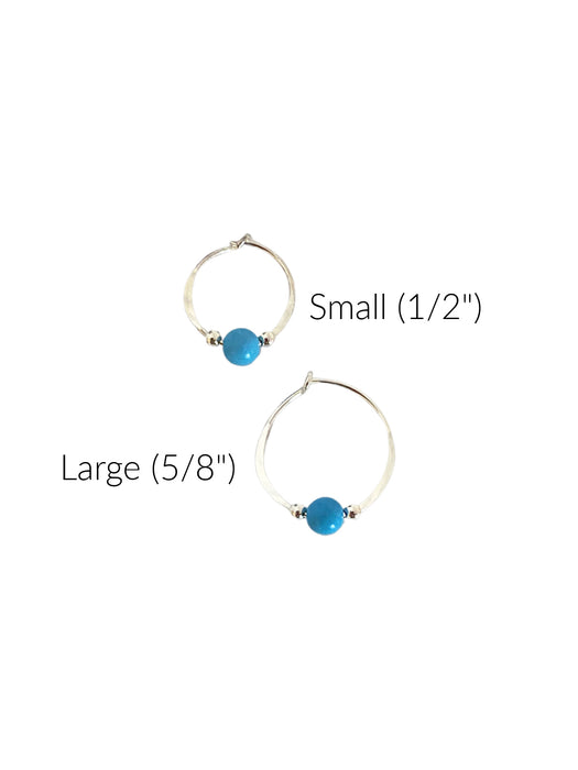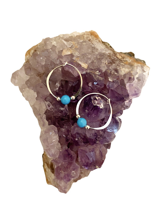 Classic handmade hoop earrings have a small polished turquoise bead centered by two smaller metal beads. Easy hook and eye style clasp.