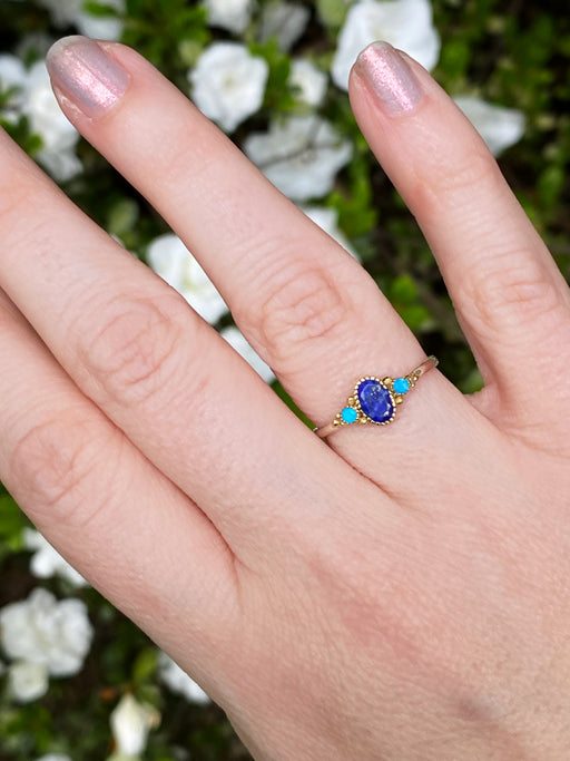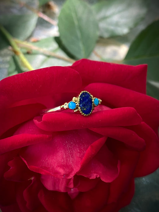 Original price $ 30.00 - Original price $ 30.00Original price$ 30.00$ 30.00 - $ 30.00Current price $ 30.00| /This ring features a polished oval of navy-blue lapis set with a bright blue turquoise gem on each side. The stones are set in brass with a silver ...