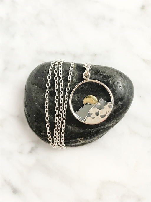 Original price $ 38.00 - Original price $ 38.00Original price$ 38.00$ 38.00 - $ 38.00Current price $ 38.00| /Salute the sun with this lovely necklace! A circle of sterling silver is filled with two mountains, one hammered and one oxidized, and a golden bra...