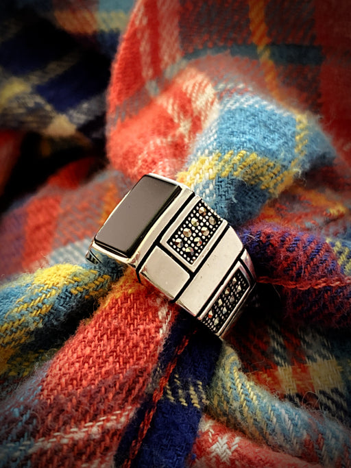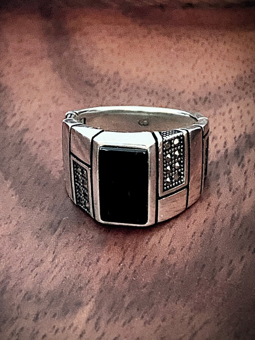 Original price $ 75.00 - Original price $ 75.00Original price$ 75.00$ 75.00 - $ 75.00Current price $ 75.00| /This sturdy signet-style ring is engraved with a geometric brick pattern and inlaid in the center with a bar of polished black onyx. The sides of t...