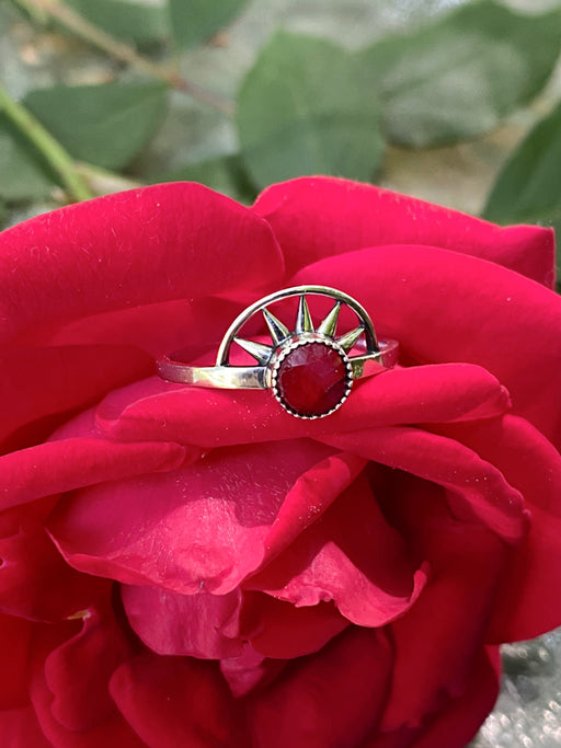 Original price $ 24.00 - Original price $ 24.00Original price$ 24.00$ 24.00 - $ 24.00Current price $ 24.00| /This ring has a faceted ruby gemstone in a crown-style setting with a semi-circle sun design on one side of the stone representing a sunrise or sun...