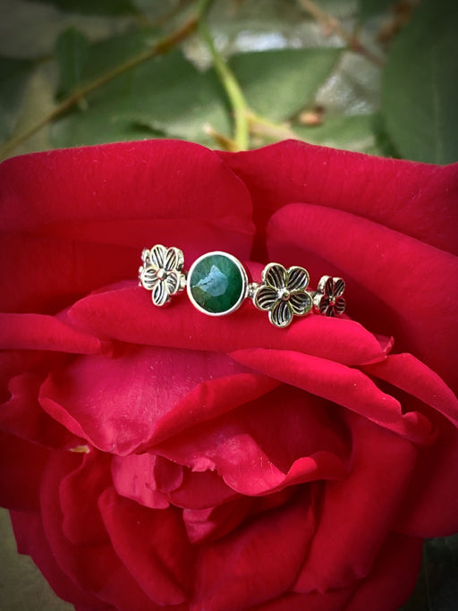 Original price $ 28.00 - Original price $ 28.00Original price$ 28.00$ 28.00 - $ 28.00Current price $ 28.00| /This nature-inspired ring has a faceted green onyx gem in the center flanked with two silver flowers with oxidized detail. Available in whole size...