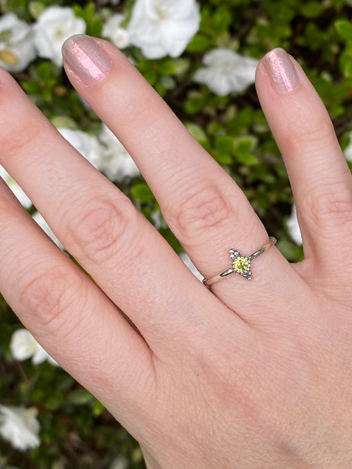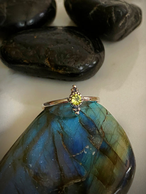 Original price $ 20.00 - Original price $ 20.00Original price$ 20.00$ 20.00 - $ 20.00Current price $ 20.00| /This petite ring has a small round peridot gemstone crown-set with three silver ball bead details on the top and bottom of the stone. Available in ...