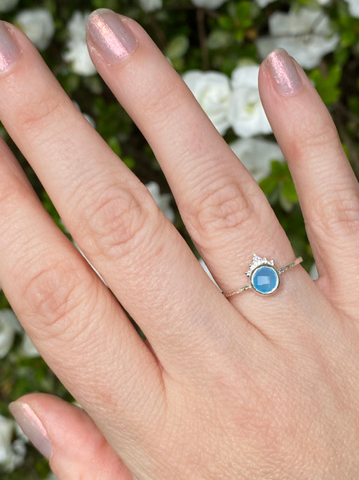 Original price $ 26.00 - Original price $ 26.00Original price$ 26.00$ 26.00 - $ 26.00Current price $ 26.00| /This elegant ring has a round faceted milky blue chalcedony stone with a ball-bead crown decoration on one side. Band has an etched texture. Also a...