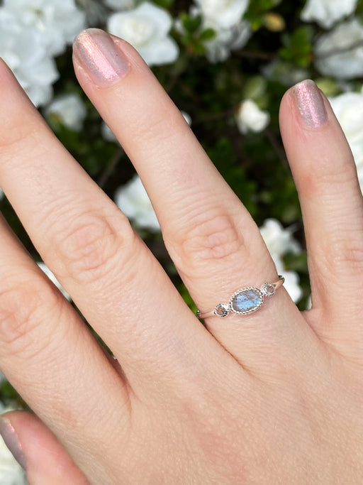 Original price $ 25.00 - Original price $ 25.00Original price$ 25.00$ 25.00 - $ 25.00Current price $ 25.00| /This elegant handmade ring has an oval labradorite stone flanked by two small round labradorite stones and set in a toothed crown style setting. La...