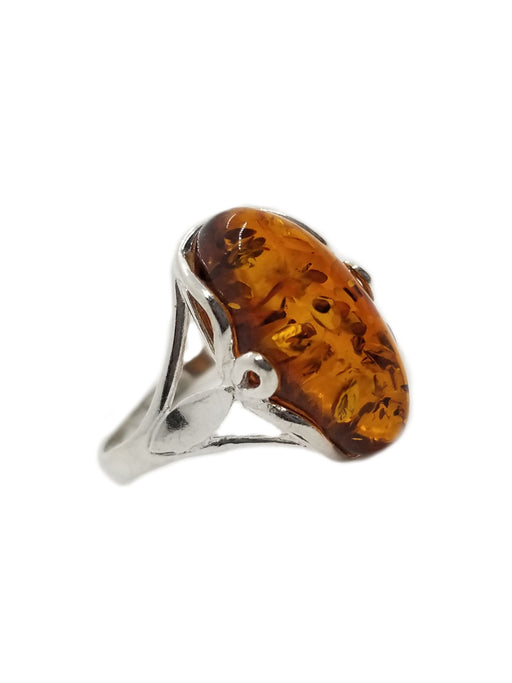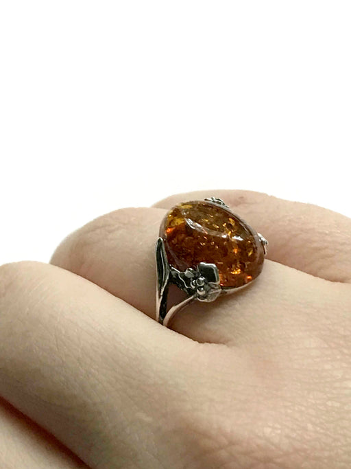 Original price $ 28.00 - Original price $ 28.00Original price$ 28.00$ 28.00 - $ 28.00Current price $ 28.00| /These stunning rings feature an oval cabochon of cognac colored amber, set with silver flowers and leaves branching up the sides, covering the spli...