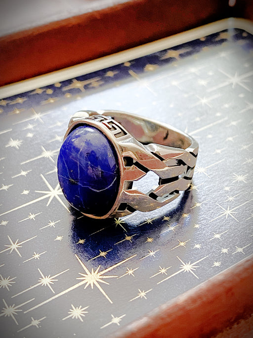 Original price $ 84.00 - Original price $ 84.00Original price$ 84.00$ 84.00 - $ 84.00Current price $ 84.00| /This sturdy signet-style ring features a braided knot band set in the center with a large blue lapis cabochon. The top and bottom of the stone sett...