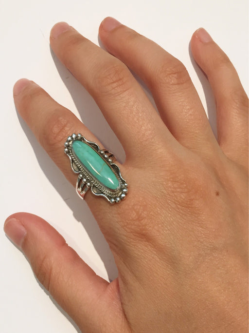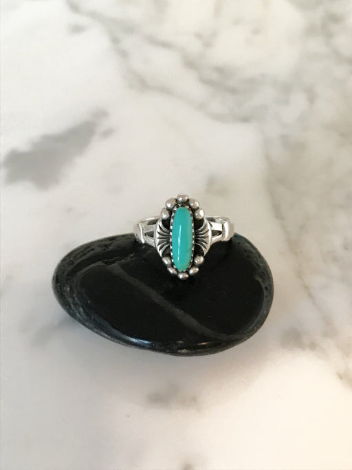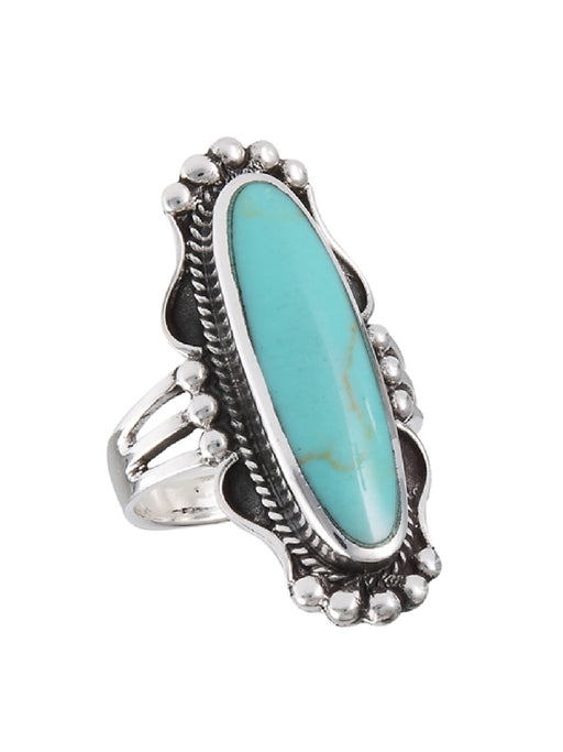 Original price $ 20.00 - Original price $ 20.00Original price$ 20.00$ 20.00 - $ 20.00Current price $ 20.00| /Southwest-style ring features an oval synthetic turquoise stone with a detailed silver border. Available in whole sizes 5-9. Sterling silver. Measu...