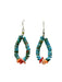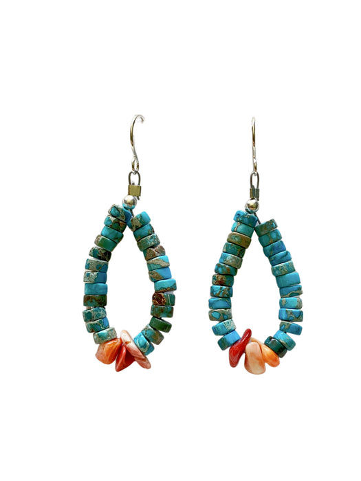 These Southwest-inspired dangle earrings feature a loop of stacked genuine turquoise heishi beads with a center of coral chips, a classic combination representing the earth & sky.