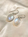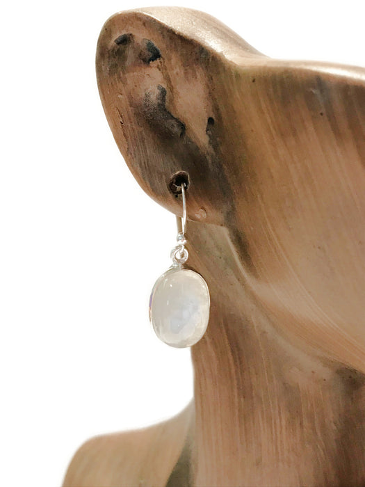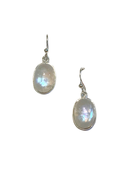 These gemstone dangle earrings are set with ethereal moonstone, fashioned into large smooth oval cabochons and set in sterling silver.