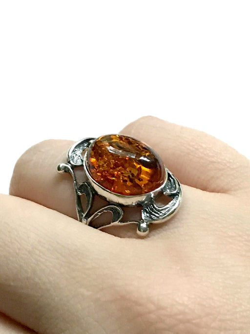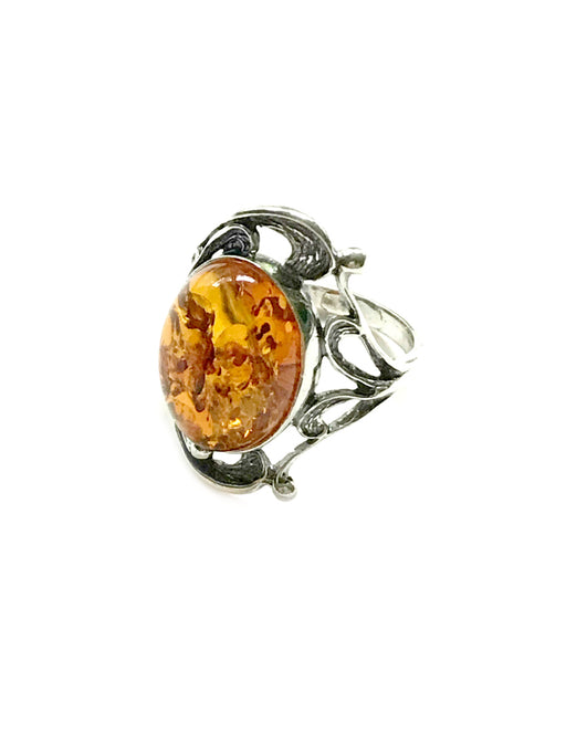 Original price $ 28.00 - Original price $ 28.00Original price$ 28.00$ 28.00 - $ 28.00Current price $ 28.00| /These stunning rings feature an oval cabochon of cognac colored amber, set with silver flowers and leaves branching up the sides, covering the spli...