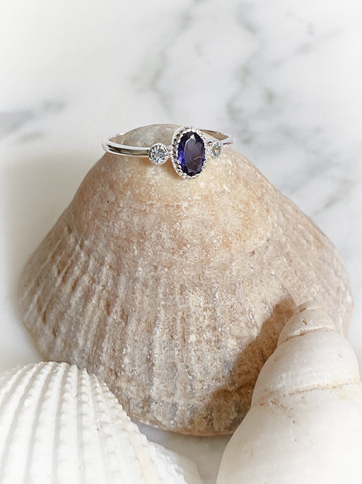 Original price $ 25.00 - Original price $ 25.00Original price$ 25.00$ 25.00 - $ 25.00Current price $ 25.00| /This elegant ring features an oval cut iolite gemstone set with a small round blue topaz gem on each side. Toothed edge detail adds extra decoratio...
