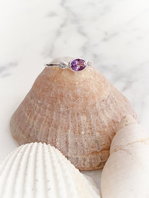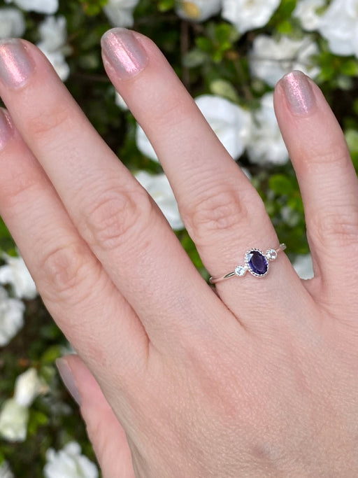 Original price $ 28.00 - Original price $ 28.00Original price$ 28.00$ 28.00 - $ 28.00Current price $ 28.00| /This elegant handmade ring has an oval amethyst gemstone flanked by two small round blue topaz stones and set in a toothed crown style setting. Ava...