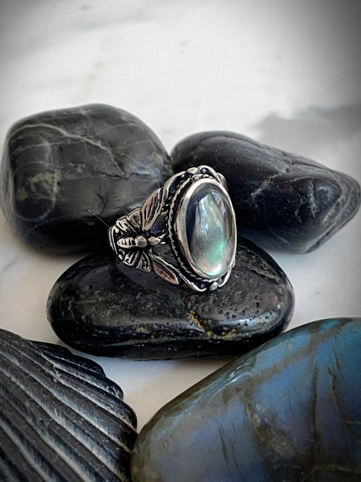 Original price $ 16.00 - Original price $ 16.00Original price$ 16.00$ 16.00 - $ 16.00Current price $ 16.00| /This petite ring is set with an oval of mother of pearl shell in a decorative nature-inspired setting with a silver leaf flanking each side. Availa...