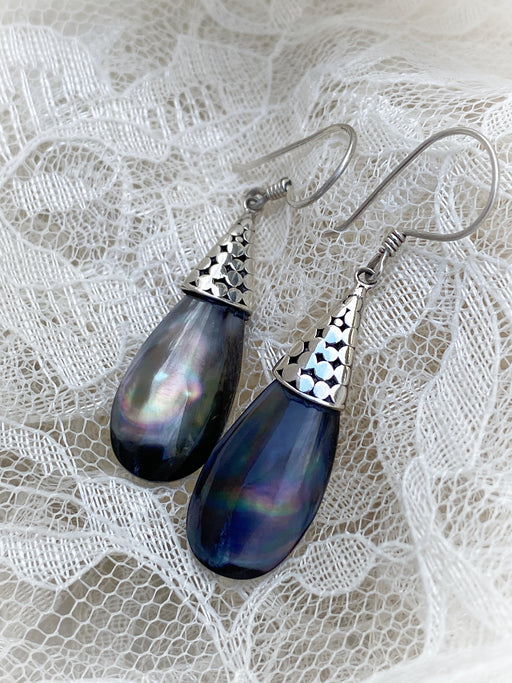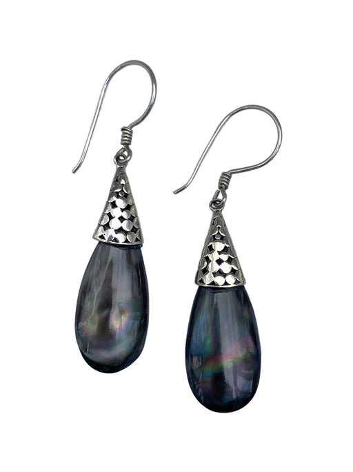 Original price $ 34.00 - Original price $ 34.00Original price$ 34.00$ 34.00 - $ 34.00Current price $ 34.00| /These handmade statement earrings feature dangles of iridescent black mother of pearl shell carved into teardrops & topped with a silver cap wi...