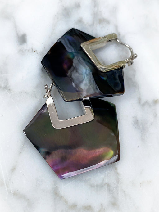 Original price $ 26.00 - Original price $ 26.00Original price$ 26.00$ 26.00 - $ 26.00Current price $ 26.00| /These hoop earrings are shell that has been shaped into pentagons and set with a silver pincatch clasp. The backside has been stabilized with an ac...