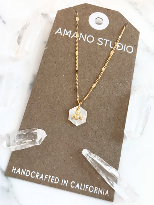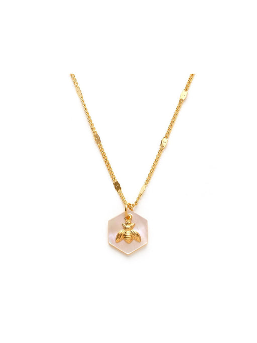 Original price $ 32.00 - Original price $ 32.00Original price$ 32.00$ 32.00 - $ 32.00Current price $ 32.00| /This summery necklace features a pendant of a golden honeybee resting on top of a mother of pearl hexagon representing a honeycomb. Comes on an 18"...