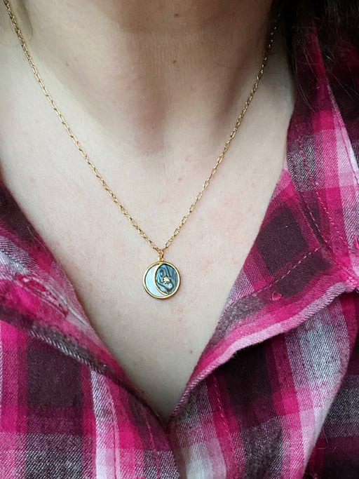 Original price $ 18.00 - Original price $ 18.00Original price$ 18.00$ 18.00 - $ 18.00Current price $ 18.00| /This celestial necklace has a medallion pendant of a creamy white shell crescent moon and a sky of blue-green abalone shell. A star is set with a c...