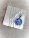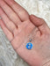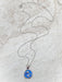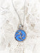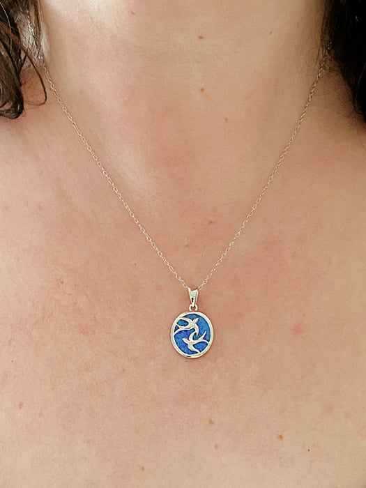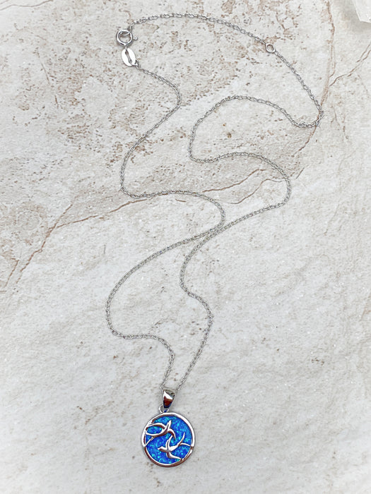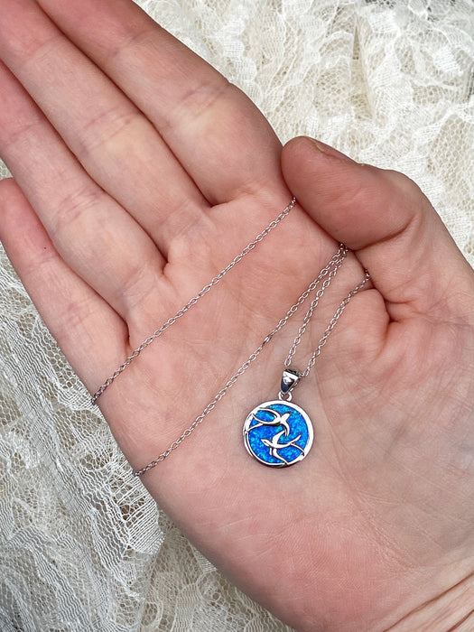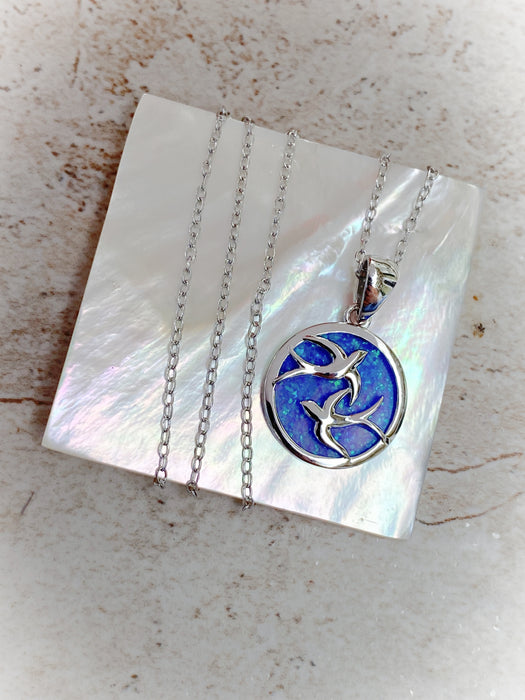 This romantic pendant necklace features a disc of glittering blue synthetic opal covered with a silver overlay featuring two birds in flight. Comes on an adjustable cable chain.