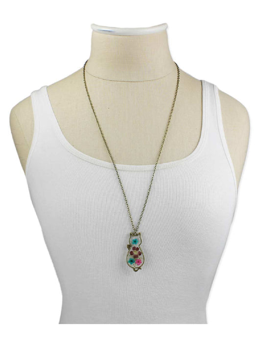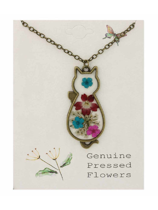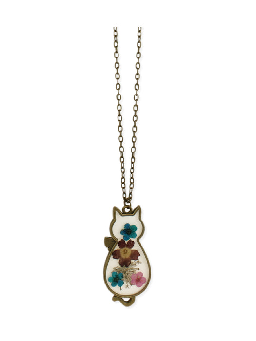 Bask in the combination of this retro cat silhouette necklace with genuine pressed flowers. Irresistibly cute! Burnished gold cat outline for vintage feel, with real multicolor flowers under clear resin