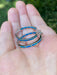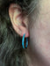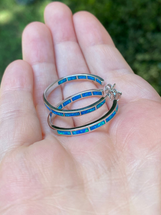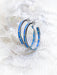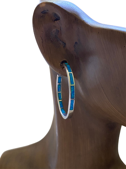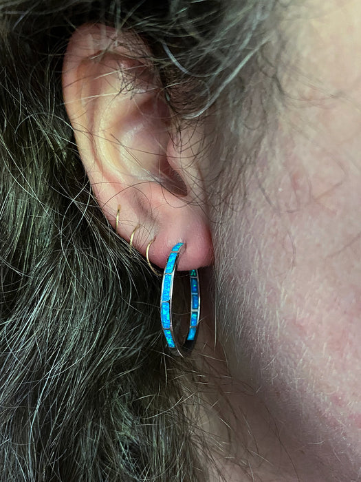 These stud earrings are hoops lined with rectangles of blue opal painstakingly shaped and inlaid along the front & inside of the hoop for maximum sparkle shown.