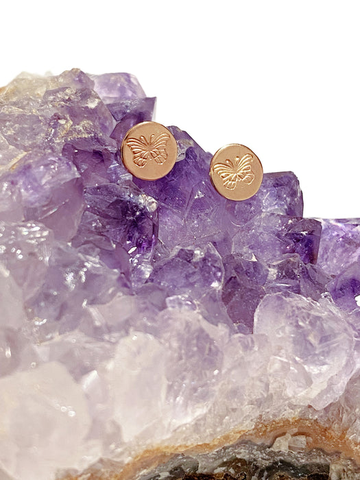 These simple disc stud earrings are embossed with the outline of a butterfly.