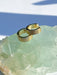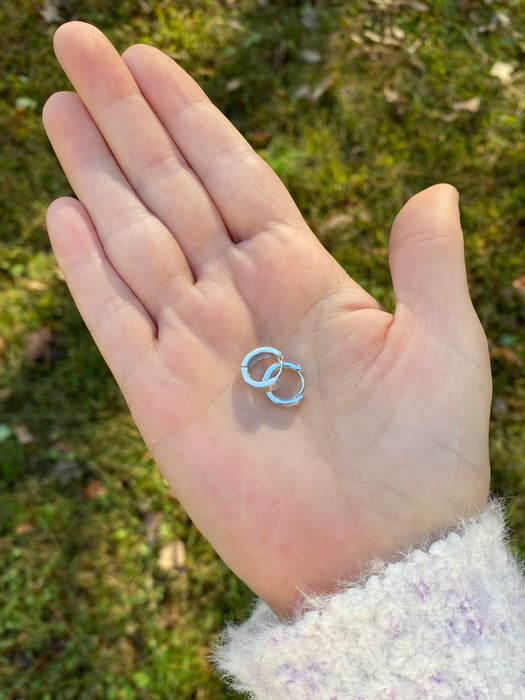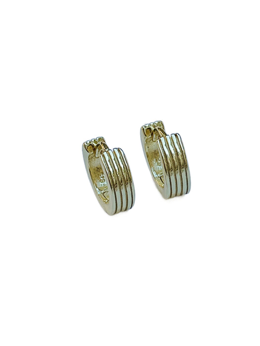 These simple huggie hoops have a linear ridged design. Huggie hoops are hinged at the bottom of the earring and click to clasp.