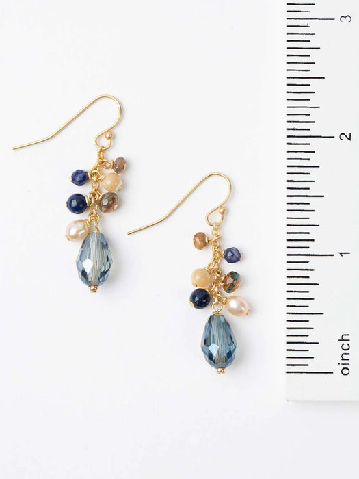 These dangle earrings feature a cascade of gemstones & glass beads to meet an iridescent blue crystal briolette focal bead, that sparkles like a starry night sky! Gemstone beads include lapis, mother of pearl and pearls.