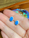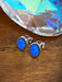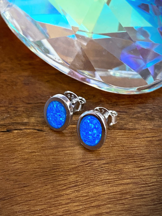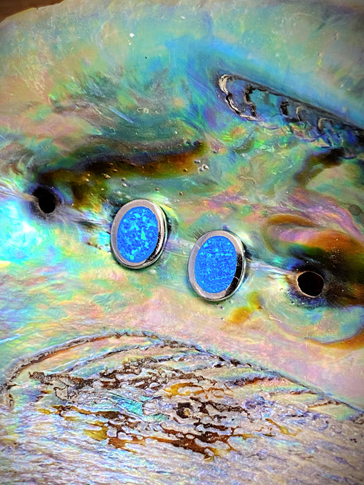 These stud earrings are large ovals of shimmering bezel set blue opal.