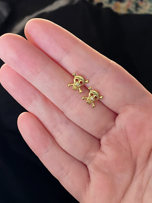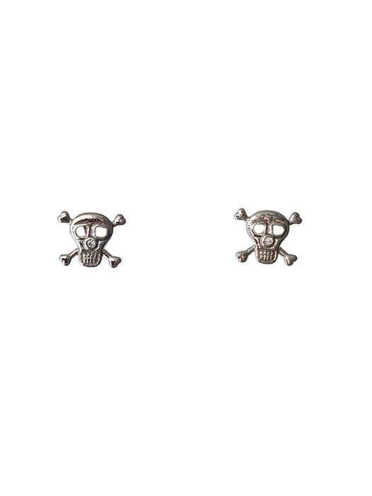 These stud earrings are skull and crossbones set with a clear CZ crystal in the nose area.