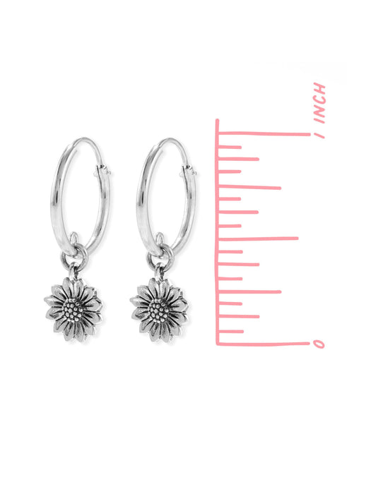 These hoop earrings have a small charm of a sunflower and a pincatch clasp.