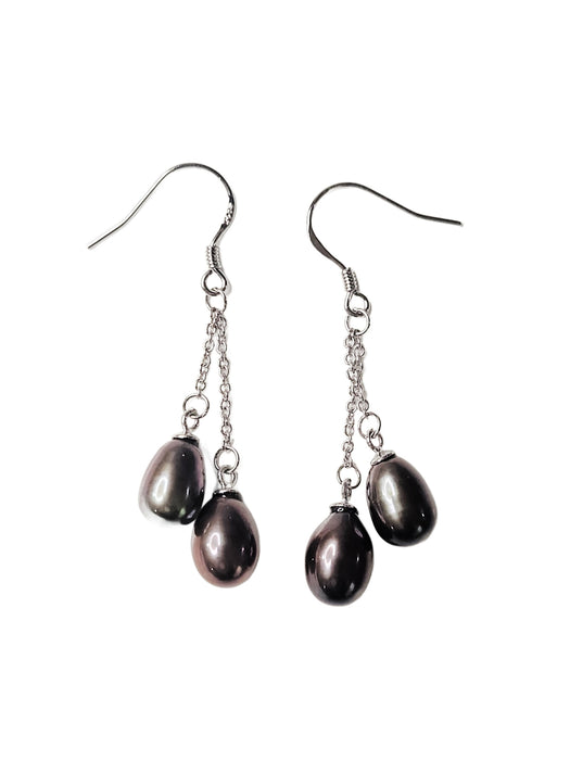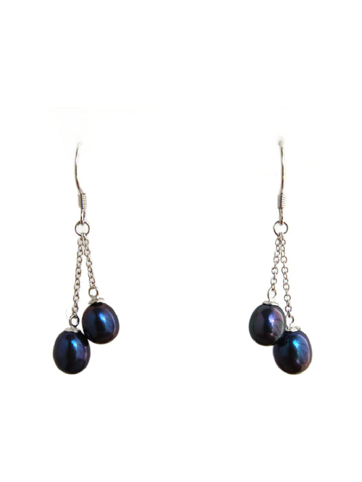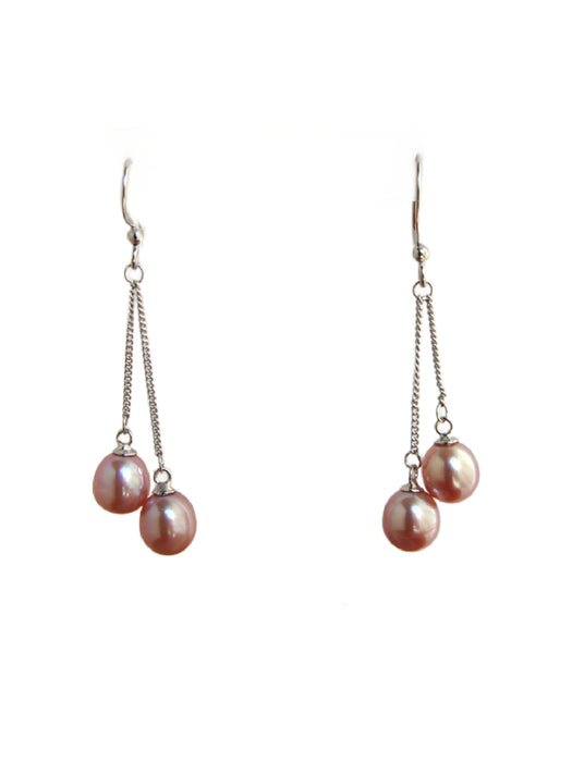 These earrings feature a dangle of two swinging freshwater pearls attached to the ear wire by a segment of silver chain.