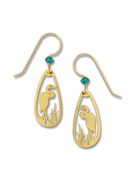 These elegant earrings feature a teardrop dangle with a serene scene of a graceful heron standing in the breezy grasses.