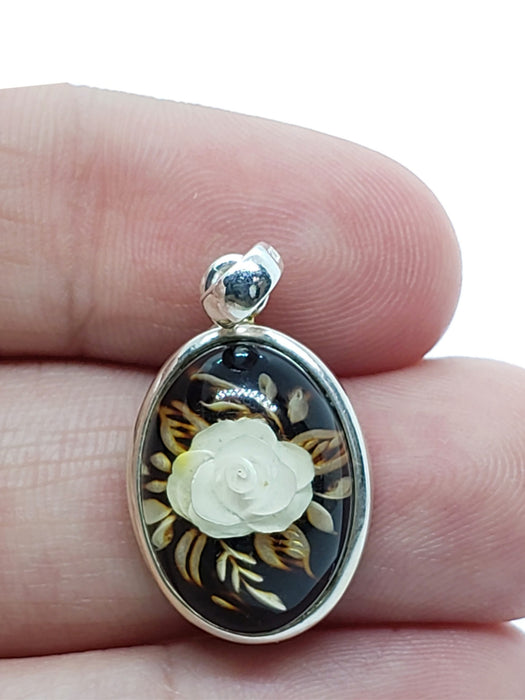 This special piece is a cabochon of Baltic amber, reverse-carved by skilled artisans to make a beautiful image of a blooming rose. Each piece is painstakingly carved from the backside using different depths to create a detailed image on the front, and makes each piece wonderfully unique!