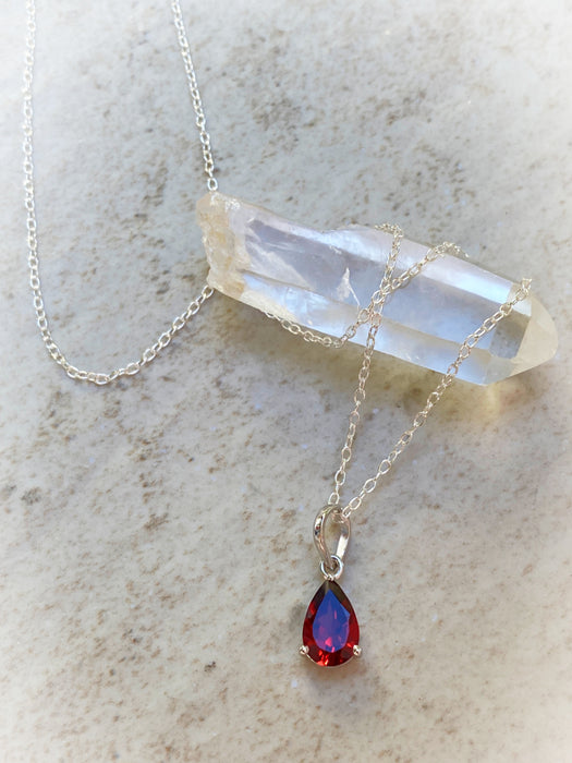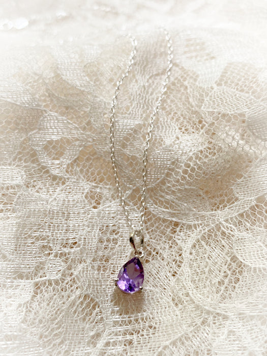 This necklace features a pear-cut gemstone set in a sterling silver setting.