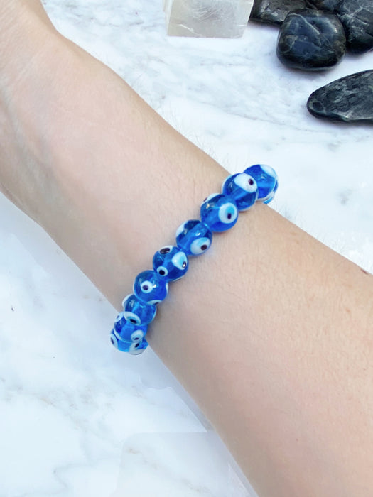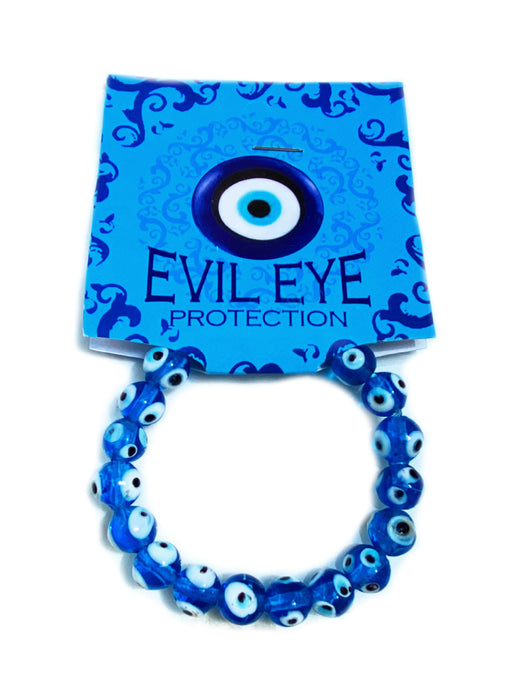 This chunky bracelet is made of aqua blue Nazar eye beads. In Mediterranean and Middle Eastern countries, the blue glass eye amulet is worn and displayed as protection against the evil eye, and also for luck. These beads are strung on heavy duty beading elastic and sized to fit most wrists.