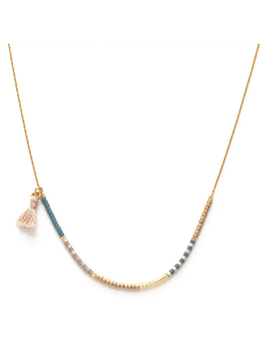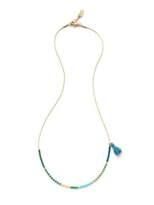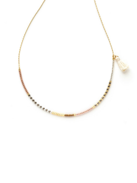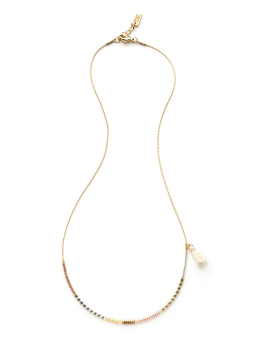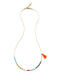 These beaded necklaces feature a center cluster of seed beads with a festive tassel strung on a simple gold plated chain. Choose from nine colorways: